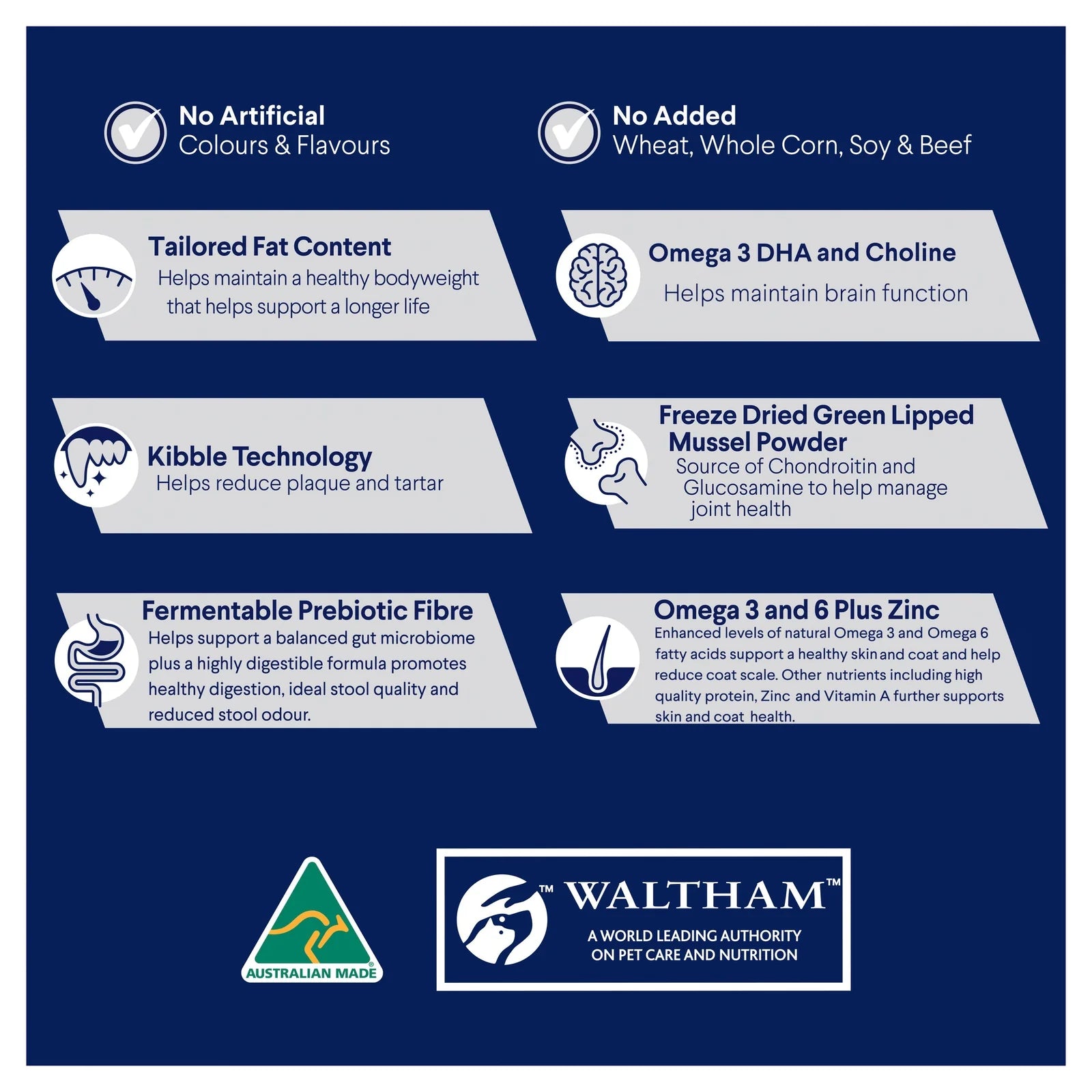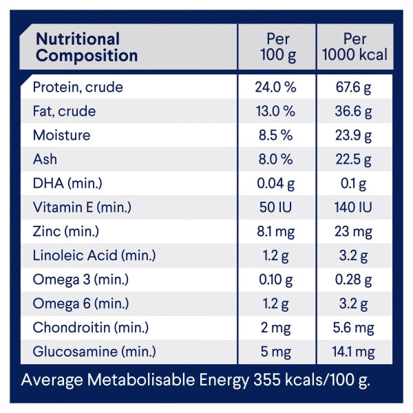 Enhanced levels of natural Omega 3 & 6 fatty acids support a healthy skin and coat and help reduce coat scale. Other nutrients including high quality protein, Zinc & Vitamin A further supports skin and coat health.