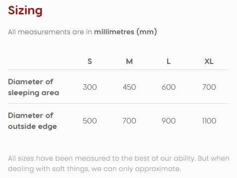 | Diameter of sleeping area | 300mm | 450mm | 600mm | 700mm | |